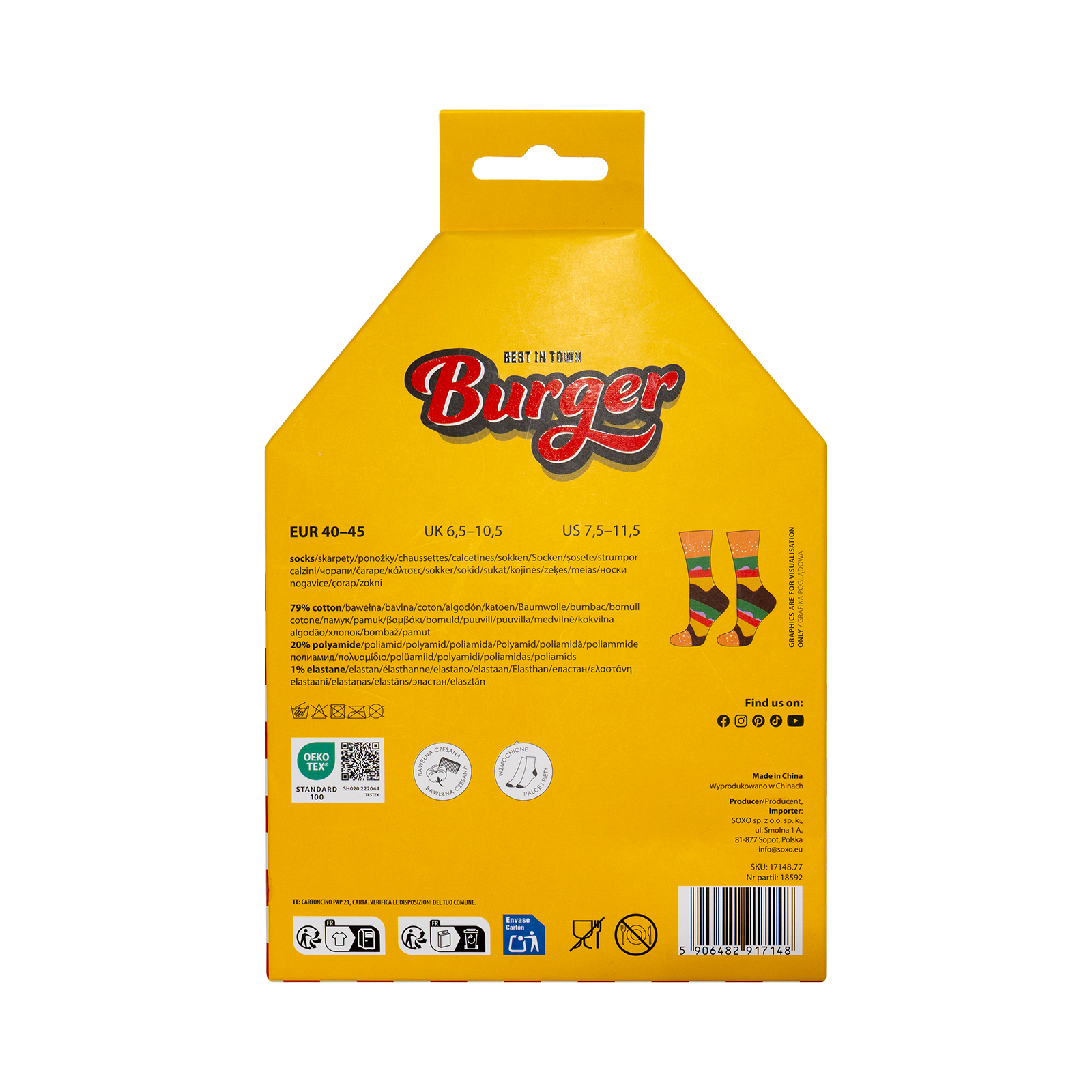 Calzini da uomo con motivo hamburger, confezionati in una scatola che ricorda il classico fast food – un’idea regalo divertente e gustosa per gli amanti del cibo e dei gadget originali.